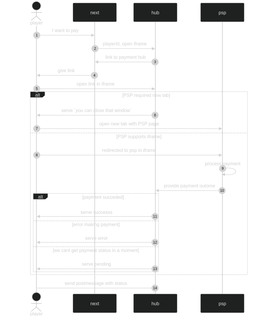 На диаграмме изображены пути взаимодействия игрока с платформой. Важно: есть две точки логического ветвления, помеченные alt на диаграмме.